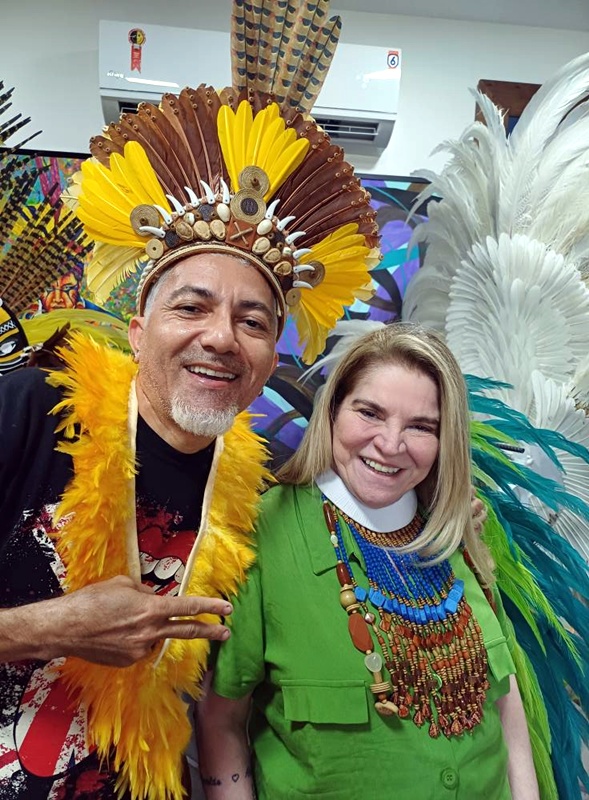 Na ilha Tupinambarana, artista plástico Jandr Reis e a jornalista Mazé Mourão com adereços do designer Herleson Maia, o queridinho fashion do momento