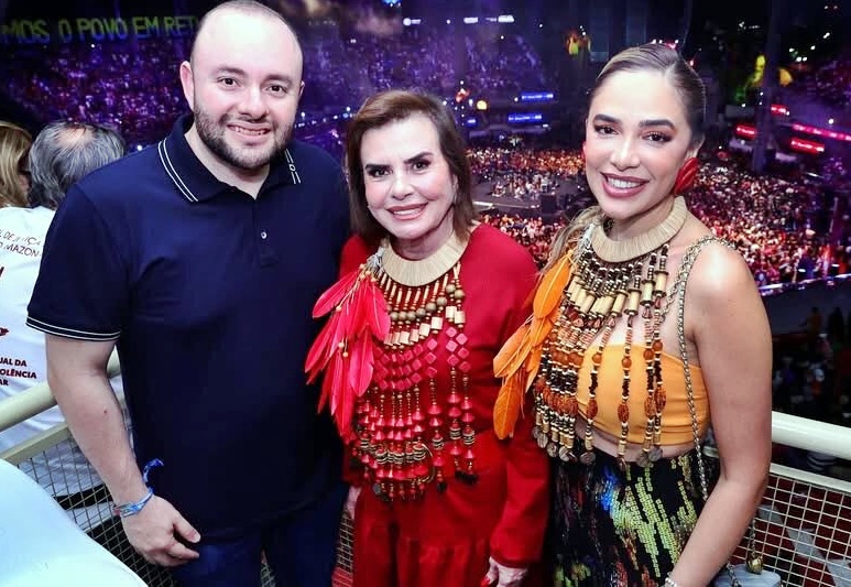 Deputado federal Fausto Júnior e sua Adria Gomes, emoldurando a Conselheira presidente do TCE AM Yara Amazônia Lins, na abertura do Festival de Parintins 2025