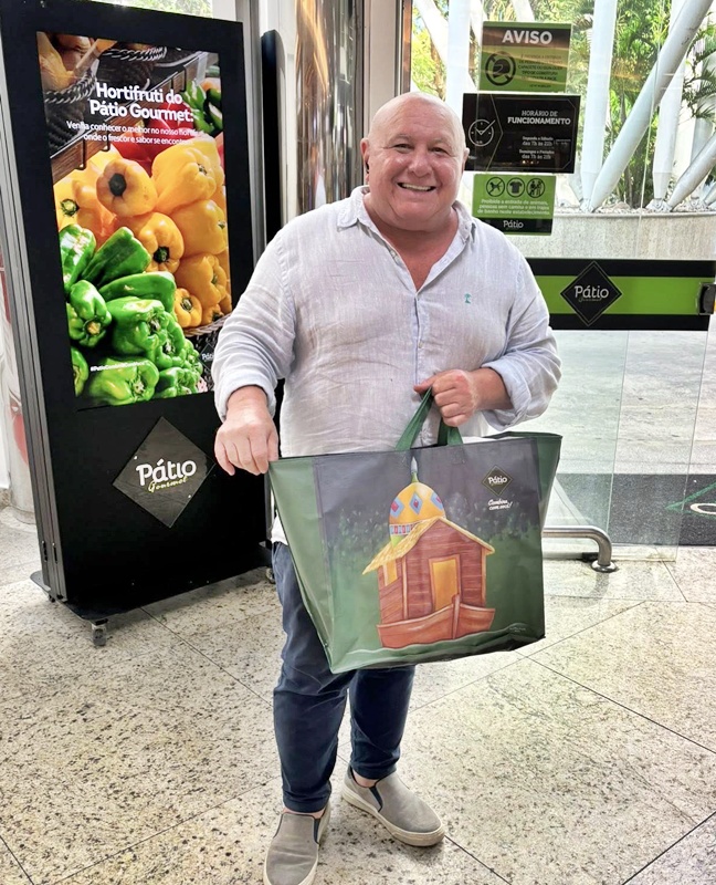 O arquiteto e urbanista Achilles Fernandes, fã do artista plástico Rui Machado. feliz com uma das muitas ecobags ilustradas pelo Rui, à venda no Pátio Goumet
