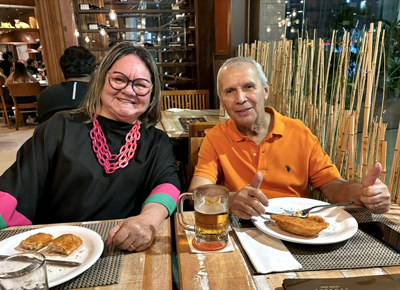 Celebrando a vida, o casal estrelado Lúcia Bittencourt e Osmar Félix de Carvalho dividem um delicioso prato do cardápio do Camarada Camarão. Coisa boa!
