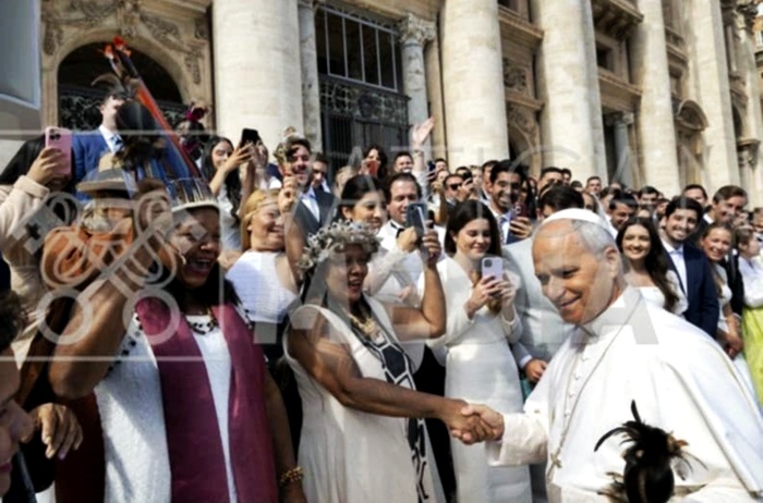O Papa Leão XIV recebeu em audiência pública, na manhã de quarta-feira (01), a estilista e gestora do coletivo MI Moda Indígena, Rebeca Ferreira Munduruku, e tocou maracá com um grupo de artistas indígenas que estavam na Praça São Pedro. Em um altar coberto, na Praça São Pedro, no Vaticano, onde estava o grupo do coletivo de moda e artes indígenas do Amazonas, Rebeca fez a entrega de um quadro do artista visual amazonense, Marius Bell, que retrata o papa Leão XIV, em óleo sobre tela. Ela segurou a emoção e disse-lhe: “Santo Papa, é uma honra vê-lo. Sou indígena do povo Munduruku e tenho um presente para Vossa Santidade. Meu grupo está lá – apontando para a área de convidados”, a poucos metros do dispositivo papal. Após ter recebido os presentes, o sumo pontífice dirigiu-se até onde estava o grupo de artistas indígenas com adornos de arte plumária nas cabeças, pegou um maracá e tocou um pouco junto com eles, em clima de alegria e emoção, ele ficou com o maracá como lembrança daquela turma de amazônidas e, os abençoou, diante da praça lotada de fiéis e peregrinos vindos de muitos países para a missa de início de mês. ais justas, transparentes e sustentáveis. Foi um momento emocionante e significativo.
