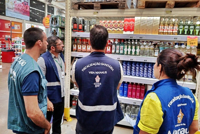 A Visa Manaus realizou, ontem, fiscalização em um supermercado da zona Oeste da cidade, como parte da operação “Zero Metanol”, que verifica a segurança sanitária das bebidas alcoólicas vendidas à população (Divulgação)